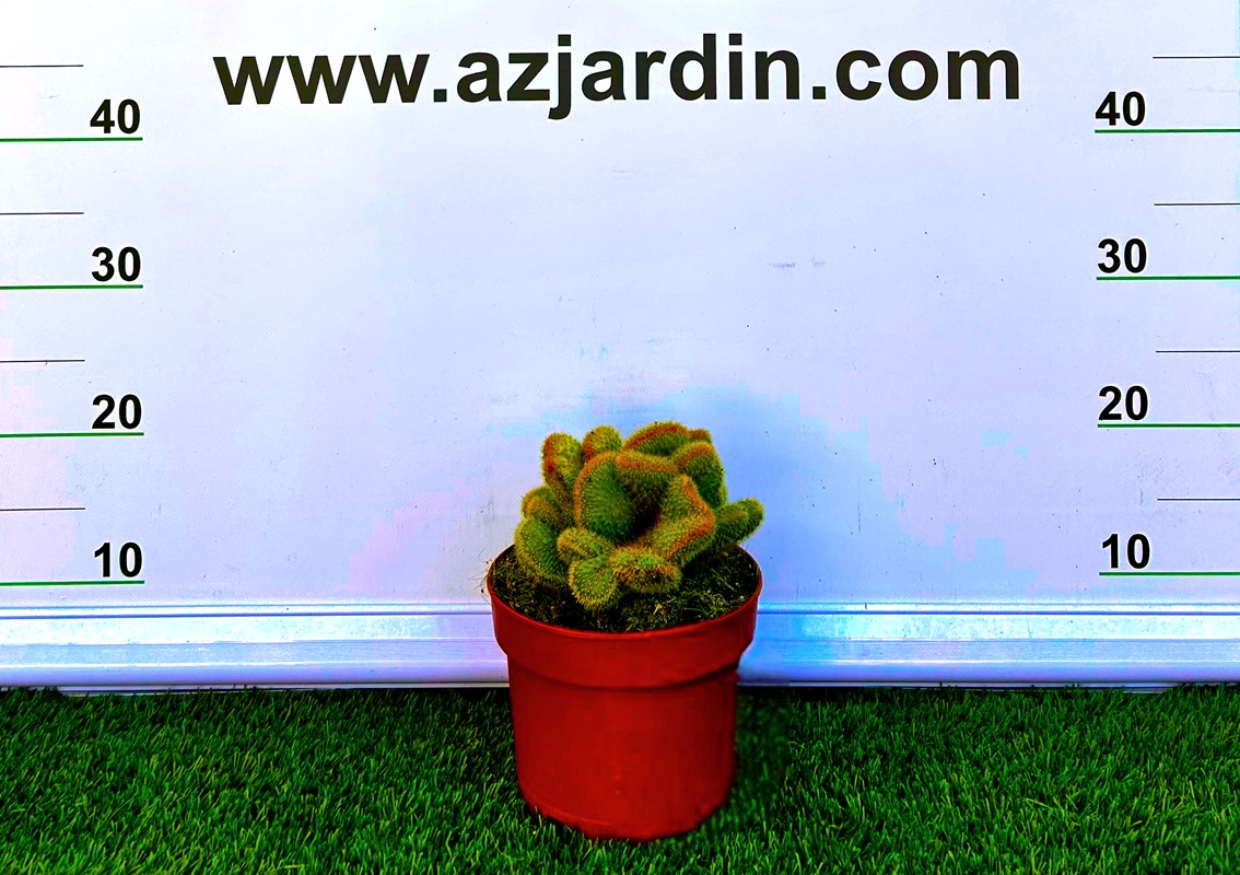 El Cleistocactus winteri f. cristata es una fascinante anomalía botánica muy valorada por su crecimiento escultural y poco convencional. Esta forma cristata o crestada es una mutación del ejemplar original, donde el punto de crecimiento se expande lateralmente creando pliegues sinuosos y ondulados que asemejan la estructura de un cerebro o un arrecife de coral. Cubierto por una densa capa de espinas cortas de color amarillo dorado, este cactus es una pieza de colección imprescindible para quienes buscan formas arquitectónicas únicas en su jardín o interior luminoso.