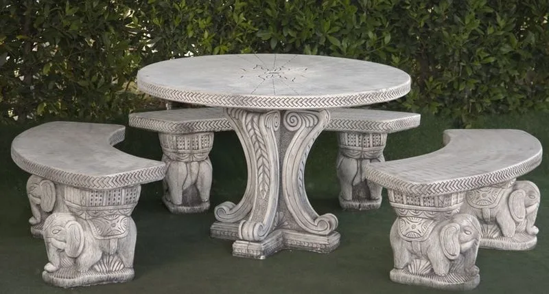 El Comedor Elefantes es un conjunto de exterior único, compuesto por una mesa redonda y tres bancos, ideal para jardines y patios. Fabricado en piedra artificial de máxima calidad a base de cemento blanco y áridos de mármol, destaca por su solidez y durabilidad. El diseño se distingue por sus bases ornamentadas con relieves que recuerdan a elefantes, aportando un toque exótico y elegante. Su construcción robusta le permite resistir condiciones meteorológicas extremas, como vientos y lluvia, lo que garantiza una larga vida útil en cualquier espacio exterior.