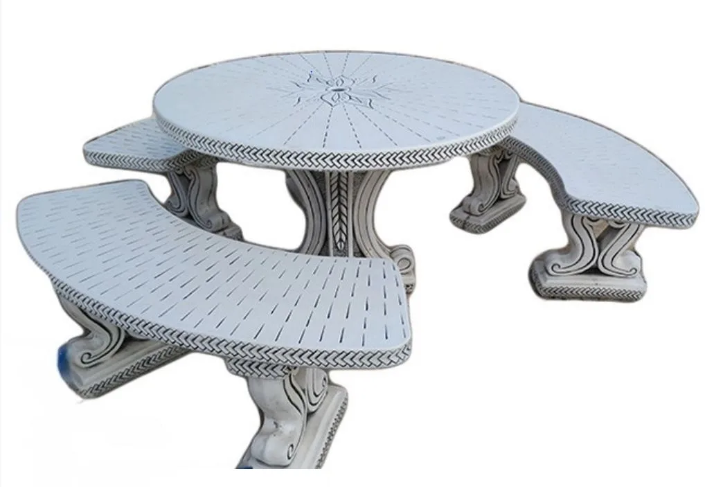 El conjunto de comedor, fabricado en piedra artificial de alta resistencia, es una opción versátil y funcional para cualquier jardín o terraza. Consta de una mesa redonda con un diámetro de 112 cm y tres bancos curvados que se ajustan perfectamente a su contorno. Su diseño práctico incluye un agujero central que permite instalar una sombrilla, ofreciendo una solución elegante y cómoda para disfrutar del exterior.
