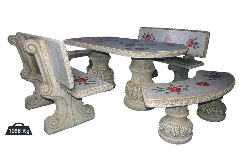 El conjunto de comedor Primavera con Respaldos es una opción robusta y elegante, ideal para un jardín o terraza. Se compone de una mesa ovalada, dos bancos curvados y dos bancos rectos con respaldo. Los tableros de la mesa y los asientos están decorados con un delicado patrón de flores rojas y hojas, mientras que las bases están talladas con motivos clásicos, que aportan un toque distintivo. Fabricado en piedra artificial de alta resistencia, este mobiliario es excepcionalmente duradero y estable, perfecto para disfrutar de reuniones al aire libre.