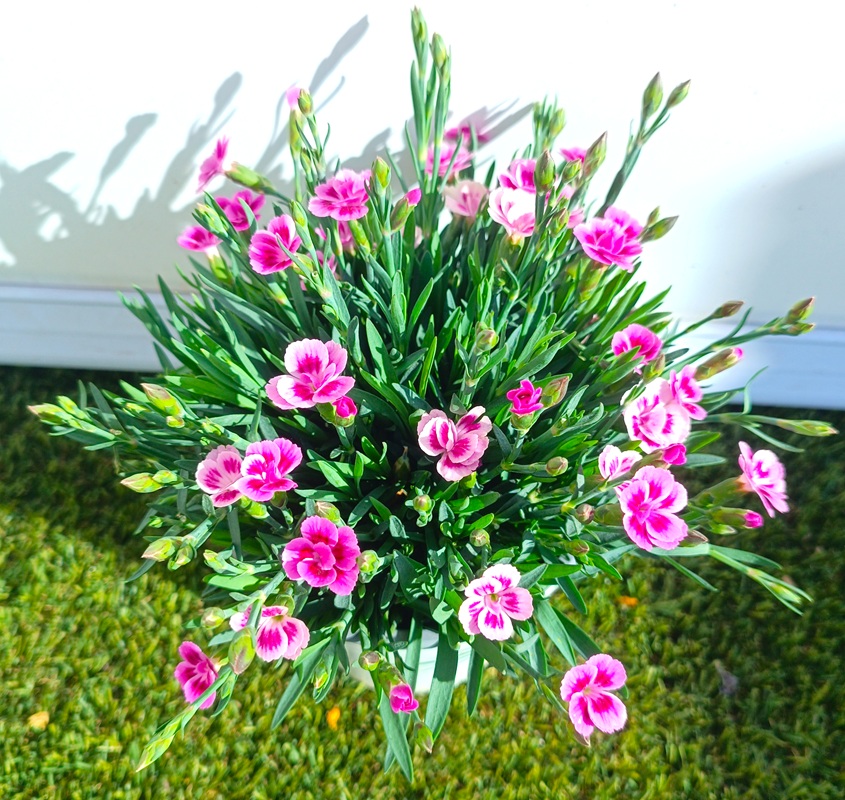 El Dianthus Pink Kisses es una de las variedades de clavelina más exitosas y cautivadoras de los últimos años, gracias a su inigualable combinación de fragancia, color y forma. Esta planta destaca por sus flores bicolores de tamaño medio que presentan un centro oscuro intensamente contrastado con bordes de un rosa más suave. Su crecimiento es naturalmente compacto y redondeado, formando un cojín vegetal denso que se cubre casi por completo de flores durante su prolongada temporada de floración. Además de su belleza visual, posee una fragancia ligera y dulce que la hace perfecta para decorar mesas de terraza, alféizares de ventanas o como un regalo vivo lleno de encanto y resistencia.