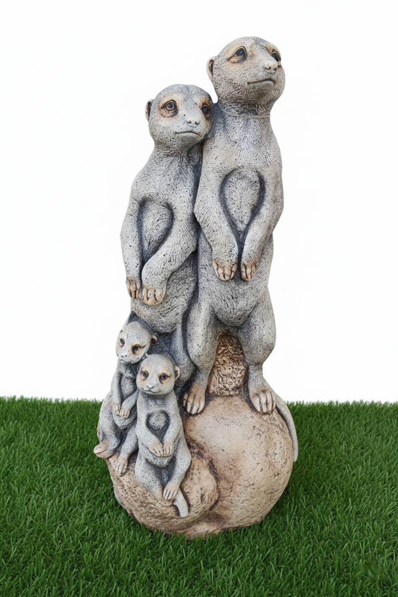 Esta imponente figura decorativa de una familia de suricatos es perfecta para añadir un toque tierno y realista a tu jardín o espacio exterior. Su robusta estructura, elaborada en piedra artificial, le confiere un aspecto natural y una gran durabilidad, lo que la convierte en una pieza ideal para destacar en cualquier rincón del hogar.