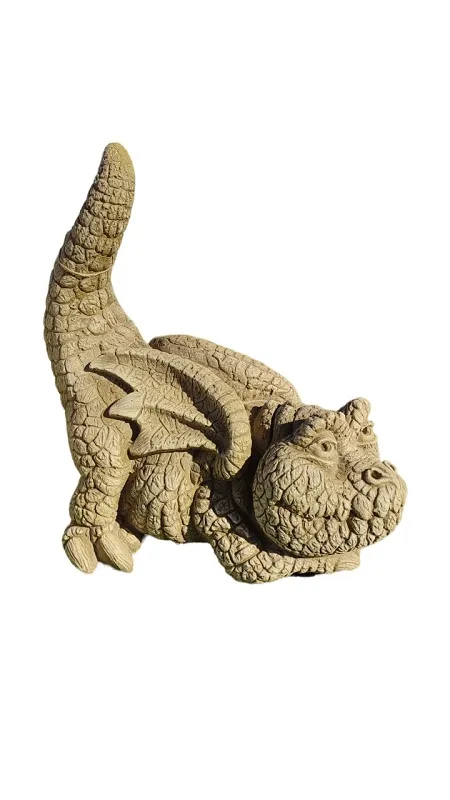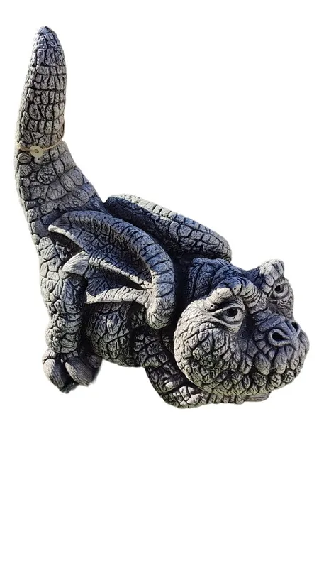 Esta figura de dragón cazador es la opción perfecta para darle un toque épico y robusto a tu jardín o espacio exterior. Representa un dragón con un cuerpo robusto y escamoso, alas plegadas en la espalda y una cola larga y segmentada que se curva hacia arriba. Su cabeza, con una mandíbula prominente y ojos hundidos, le da una expresión imponente y guardiana. Fabricada en hormigón armado, es altamente resistente a las inclemencias meteorológicas, incluyendo viento, lluvia y rayos UV, lo que garantiza su durabilidad a la intemperie. Cada figura es hecha a mano, lo que le confiere un toque único y especial, ideal para coleccionistas o amantes de la fantasía.
