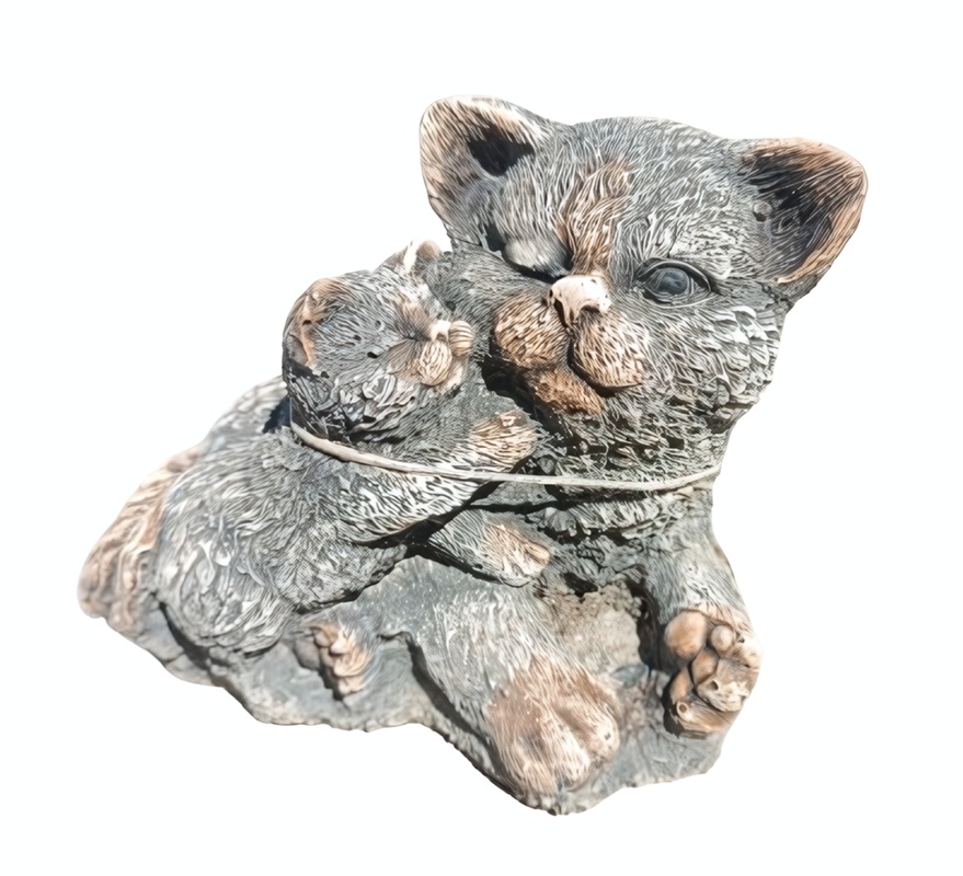 La figura Gato con Gatito es una pieza decorativa cargada de simbolismo y calidez, ideal para aportar un toque de ternura y serenidad a cualquier espacio del jardín o del hogar. Su diseño captura un momento de protección y afecto entre una madre y su cría, con un nivel de detalle que resalta las texturas naturales y las formas fluidas de los felinos. Fabricada en piedra artificial de alta calidad, esta escultura destaca por su gran solidez y su capacidad para mantenerse impecable ante la exposición directa al sol y al agua sin necesidad de mantenimiento. El acabado se aplica de forma manual, logrando una pátina que imita la textura de la piedra natural envejecida, lo que otorga a cada unidad un carácter exclusivo y una estética equilibrada.