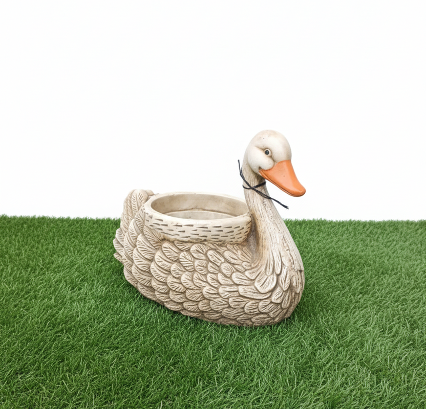 El Pato Ánade es una figura decorativa y funcional diseñada como macetero, perfecta para aportar un toque rústico y natural a su jardín, terraza o patio. Fabricado en piedra artificial resistente, su detallado diseño imita la textura de las plumas y presenta un acabado patinado que le otorga un aspecto envejecido y auténtico, ideal para el exterior.